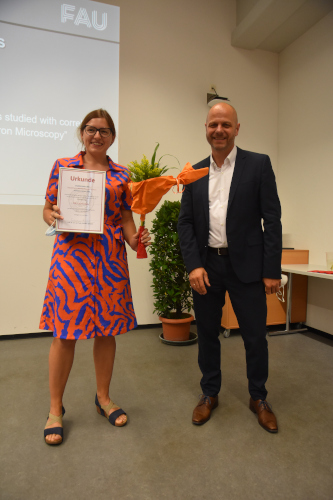 Zuletzt vergab Prof. Spiecker die Departmentpreise. Der Preis für den besten Bachelorabschluss ging an den NT-Studenten Julian Kauth. Sven Strüber aus dem Studiengang MWT erhielt den Master-Studienpreis. Für die besten Promotionen wurden Dr. Lilian Vogl und Dr. Dorota Kubacka ausgezeichnet.