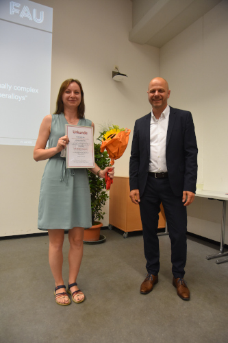 Dieser richtete seine Worte vor allem an die frisch gebackenen Habilitanden PD Dr.-Ing. habil. Tobias Fey vom Lehrstuhl für Glas und Keramik (FAU) und PD Dr. habil. Paolo Moretti vom Lehrstuhl für Werkstoffsimulation (FAU), die im Zuge des Sommerfests nicht nur die Festvorträge, sondern auch ihre Habilitationsvorträge hielten.