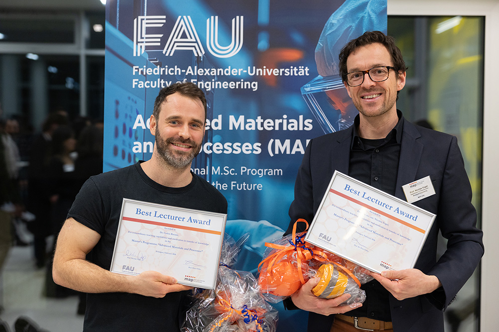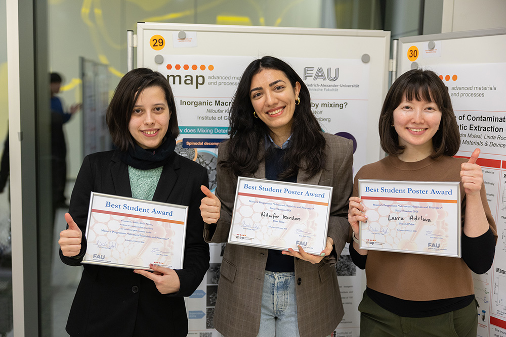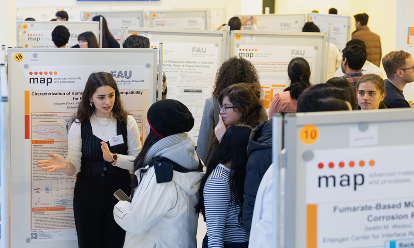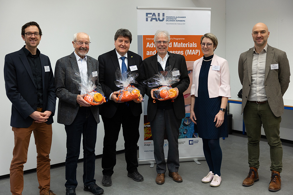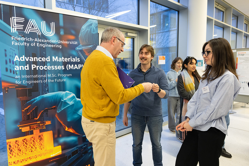 Am 4. Februar 2026 feierte der Studiengang sein 20 jähriges Jubiläum. Das Programm umfasste ein Symposium mit Vorträgen verschiedener in den MAP-Studiengang eingebundener Professoren, die die historische Gründung und erste Schritte des Programms (Prof. Müller, Initiator des MAP-Programms), die aktuelle Entwicklung (Profs. Felfer und Vogel, MAP-Chairs), die Bedeutung des Studiengangs für die Entwicklung der FAU (Prof. Peukert, langjähriger Dozent in MAP), sowie die generelle Bedeutung von internationaler Forschung und Austausch wissenschaftlicher Ideen für die Gesellschaften von Host- und Gastländern (Prof. Boccaccini), darstellten. Die jährliche Poster Session mit Beiträgen der MAP-Studierenden des dritten Semesters, die ihre Miniprojekte im Rahmen des Festakts präsentieren, rundeten die Veranstaltung ab.